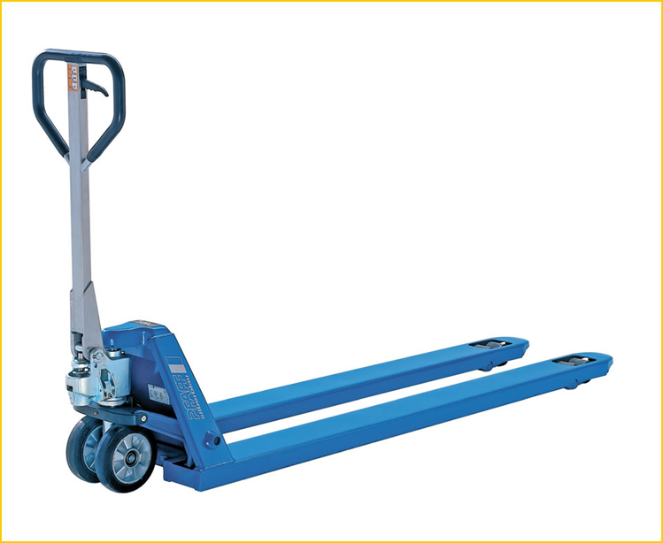 Kapasite 2000 - 3500 kg Yoğun iş yükünde uzun paletli ürünlerin ve kutu paletlerin profesyonel bir şekilde taşımak için. Özellikler • Kaldırma, sürme ve indirme işlemlerinin tek elle yapılması için ergonomik güvenli kontrol kolu. • Güvenli taşıma için ergonomik kauçuk kontrol kolu. • Sert krom kaplama piston ve basınç boşaltma valfli, düşük bakım gerektiren yüksek performans hidrolik pompa. • Güçlü çelik yapıya sahip iskelet ve çatallar, ayarlanabilir bağlantı rotları, özellikle sertleştirilmiş dingiller ve yüksek kalite toz kaplama uzun bir hizmet ömrünü garanti eder. • Uzun yüklerin taşınması için 1500’den 3.000 mm’ye kadar çatal uzunlukları. • Dar yerlerde kolay taşıma için her bir tarafa 105 derece dönüş açısı