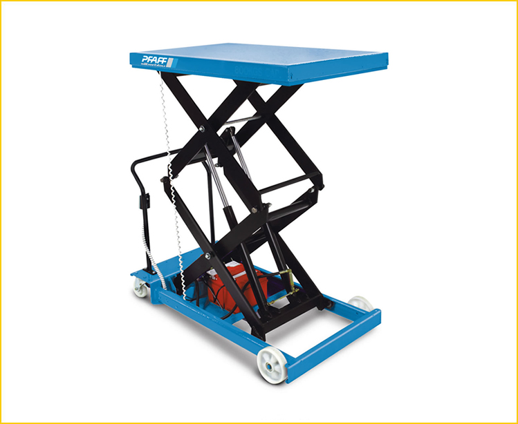 Kapasite 125 - 800 kg, Platform yüksekliği maks. 1.900 mm Kullanım alanlarına bakılmaksızın ürünlerin kaldırılması ve sevk edilmesi için. Özellikler • Emniyet fonksiyonlu elektrikli hidrolik sistem veya pedallı manuel hidrolik sistem, • Basınç tahliye ve indirme valfinden dolayı yüksek güvenlik. • Masif dümen makası ile 300 kg üzerinde güçlü tek makas yapı. • Güvenli bakım çalışmaları için mekanik ayarlı eksen etrafında dönen platform. • Düşük OAH ile kompakt tasarım. • Bakım gerektirmeyen tekerlek yatakları ile dümen ve sabit tekerlekler. Tek bir dümen tekerleği park için konuma kilitlenebilir. • EN 1570 ve 2006/42/EG sayılı makine direktifine göre.