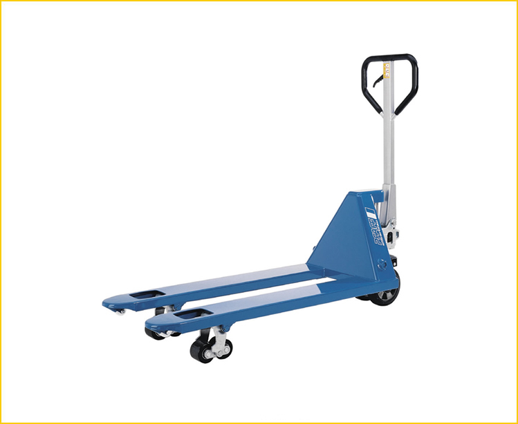 Kapasite 2500 kg Yoğun iş yükünde kısa paletli ürünlerin ve kutu paletleri profesyonel bir şekilde taşımak için. Özellikler • Kaldırma, sürme ve indirme işlemlerinin tek elle yapılması için ergonomik güvenli kontrol kolu. • Güvenli taşıma için ergonomik kauçuk kontrol kolu. • Sert krom kaplama piston ve basınç boşaltma valfi, düşük bakım gerektiren yüksek performans hidrolik pompa. • Güçlü çelik yapıya sahip iskelet ve çatallar, ayarlanabilir bağlantı rotları, özellikle sertleştirilmiş dingiller ve yüksek kalite toz kaplama, uzun bir hizmet ömrünü garanti eder. • Küçük yüklerin taşınması için 800’den 1000 mm’ye kadar çatal uzunlukları. • Dar yerlerde kolay taşıma için her bir tarafa 105 derece dönüş açısı.