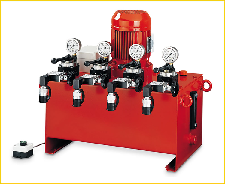 Manuel Ventilli Çok akışlı hidrolik pompalar, her bir silindire eşit miktarlarda hidrolik yağ enjekte ederek aynı anda ve aynı hızda 4 silindiri hareket ettirebilir. Bu ilke, makinelerin veya benzeri yüklerin merkezi bir noktadan senkronize kaldırılmasını sağlar. Farklı yükleme koşulları altında bile, silindirler senkronize halde hareket eder. Simetrik olmayan yükün dengelenmesi her bir tek silindirin bağımsız kontrolü ile kolaylıkla yapılır. Kaldırma kademesi, uzaktan kumanda ile başlatılır ve herhangi bir zamanda durdurulabilir ve devam ettirilebilir. Yükün indirilmesi, her bir devre için ayrı ayrı kısma vanası ile birlikte yön vanasının çalıştırılması ile yapılır. Çok akışlı pompalar, her türlü hidrolik silindir, makine krikosu veya kademeli kaldırma tertibatı çalıştırabilir. Özellikler • 4 eşit, bağımsız ve ayrı yağ akışlarından dolayı 4-noktalı senkronize kaldırma. • 4 yönlü manuel olarak çalıştırılan yön vanaları veya 4 elektromanyetik yön vanaları tüm takılı 4 silindirin bağımsız veya birlikte kontrolüne izin verir (yüklerin kolay dengelenmesi). • Her bir devredeki kontrol valfı sayesinde güvenli yük tutma. • Tek adam merkezi çalışma. • Manuel vanalarla birlikte uzaktan kumanda vasıtasıyla motor açma/kapma anahtarı. • Elektromanyetik vanaları çalıştırmak için komple uzaktan kumanda. Opsiyonlar • Tüm pompa paketleri, 4/3 yön vanaları ile sunulur (çift etkili hidrolik silindirlerin kontrol edilmesi için). • Tüm güç kaynakları tesis yerinde çalışma için uygun bir koruma çerçevesi ile sağlanabilir. Ayrıca 2 sabit ve 2 döner tekerleğe sahip el arabası şasileri talep üzerine sunulur. Teslimat kapsamı Dört devreden her biri için, kullanıma hazır teslimat içeriği: Gliserin sönümlü basınç ölçer, 3 yönlü kontrol vanası, emniyet kontrol vanası, bir dişi yarım bağlantı elemanı. Ayrıca: Hidrolik yağ, taşıma kolları, motor açma/kapama anahtarı, motor bağlantı kablosu, uzaktan kumanda, transformatör ve motor röleli elektrik kutusu, yağ seviyesi ölçer ve yağ doldurma/havalandırma kapağı. Tüm çok akışlı güç kaynakları ayrıca çift etkili hidrolik silindirleri çalıştırmak için 4 yönlü vanalar ile sunulmaktadır. Elektromagnet Ventilli 4 hidrolik silindiri, bir uzaktan kumandaya sahip elektromanyetik vanalar ile bağımsız ve senkronize bir şekilde ilerletmek için elektromanyetik yön vanalı güç kaynakları. Emniyet kısma vanalı elektromanyetik vanalar, bağlı olan tüm hidrolik silindirlerin hassas kontrolüne izin verir.