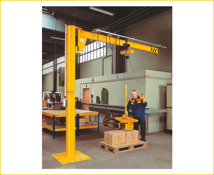 Optimal yüksekliğe sahip yükseltilmiş bom, dönüş aralığı 270°Hafif, dolaşmaz kiriş yapılı ve alçak üst boşluğu. Bom, güçlendirilmiş çelik borudan imal bir rulman sütun ile donatılabilir. Vincin boyutuna bağlı olarak ve festonlu güç kaynakları ile birlikte, bomun dönüş aralığında kısıtlamalar mümkün olabilir. Montaj • Tespit cıvata ve şablonlu taban flanşı. • Harç kartuşları, tespit saplamaları dahil taban levhasının sabitlenmesi (kaynaklı) (somunlar, kilitleme somunları ve rondelalar ile komple). • Harç kartuşları, tespit saplamaları dahil dübel taban levhasının sabitlenmesi (cıvatalı) (somunlar, kilitleme somunları ve rondelalar ile komple). • Değiştirilebilir yer için taşınabilir tertibat. Opsiyonlar • Dönüş durdurucular (tamponlar)önceden belirlenmiş sabit dönüş aralığı için inşaat yerinde donatılabilir. • Dönüş sırasında bom hızını kontrol etmek için dönüş freni. 5 m uzun bom uzunluğu veya 4 m’den fazla üst boşluğu için tavsiye edilir. Bu bomun kontrolsüz hareketini önler. • Açık hava kullanımı için daha fazla boya katmanı (120 um) veya sıcak daldırma galvaniz. • Bomu sabit bir konumda tutmak için manuel kilitleme tertibatı (rüzgar koruması). • Açık hava kullanımı için ceraskal örtüsü. Teslimat kapsamı • Elektrik sistemi, kilitlenebilir ana anahtar, 4000 mm’ye kadar bomlar için kablo destek borularına sahip yuvarlak kablo güç kaynağı ile donatılmıştır. • 4500 mm üzeri bomlar festonlu kablo güç kaynağı ile donatılmıştır. Alçak vinçlerdeki kablo sarkmasından dolayı, kısa bomlarda bile festonlu kablo kullanılmasını tavsiye ederiz. • Ön ve arka bölümlerde şaryo durdurucuları. • Vinçler, kullanım kılavuzu ve komple üretici dokümantasyonu ile birlikte sağlanır.