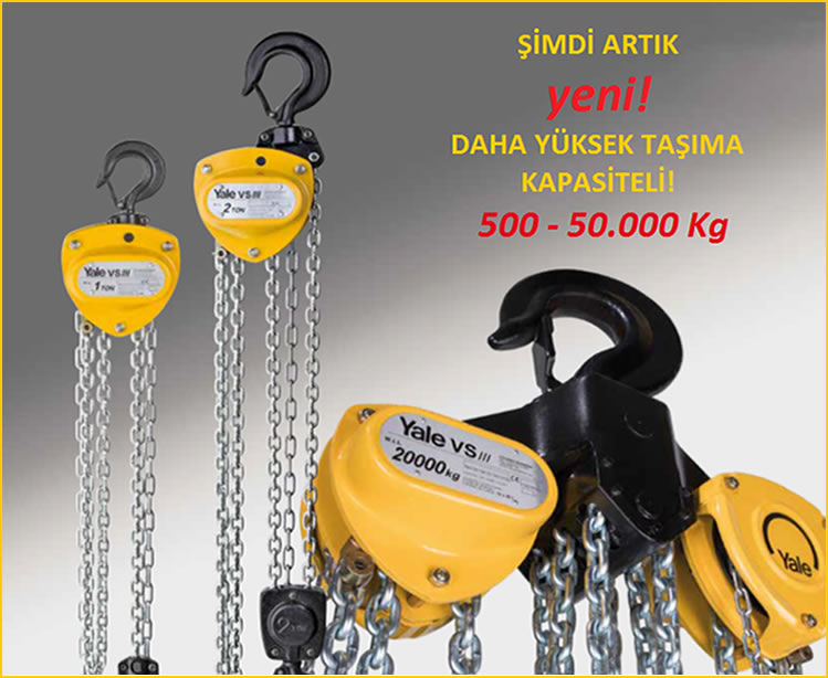 Kapasite 500 - 50.000 kg Yale manuel zincirli ceraskal VSplus kanıtlanmış VS modelimizin yeni versiyonu olup, teknik olarak daha da geliştirilmiş halidir. Son derece güçlü tamamen çelik yapı, tahrik pinyonu ve yük zinciri kasnağı ile dişli kutusu için yüksek kalite rulmanlarla standartlar belirlenmektedir. Maksimum korozyon koruması ve bakım kolaylığı bu modelin göze çarpan özellikleridir. Özellikler • Yan levhalar ve güçlendirilmiş muhafaza kapakları arasındaki 4 güçlü cıvata, daha fazla stabilite sağlar. • Hassas işlenmiş kılavuz silindirleri yük zincirinin akıcı bir şekilde çalışmasını sağlar. • Tamamen kapalı yağlı rulmanlar ömür boyu uzun bir hizmet ömrü sağlar. • Toz, yabancı maddeler ve korozyona karşı korumalı fren sistemi. • Çelik tespit pimleriyle birlikte destekleyici şeritlere sahip güçlendirilmiş el tekerleği muhafazası ceraskal stabilitesini daha da arttır. • Daha fazla korozyon koruması için standart çinko kaplama yük zinciri.